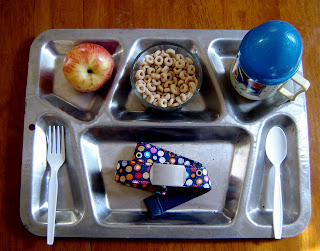 For now, they are their tidy steel selves, unblemished. I am not sure what a belt has to do with breakfast trays, but it gave me an excuse to get out my Sesame Street Rocket mug and set up a little eye candy.